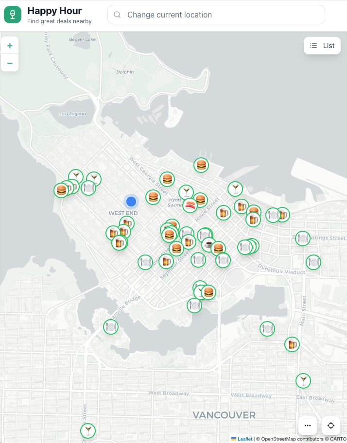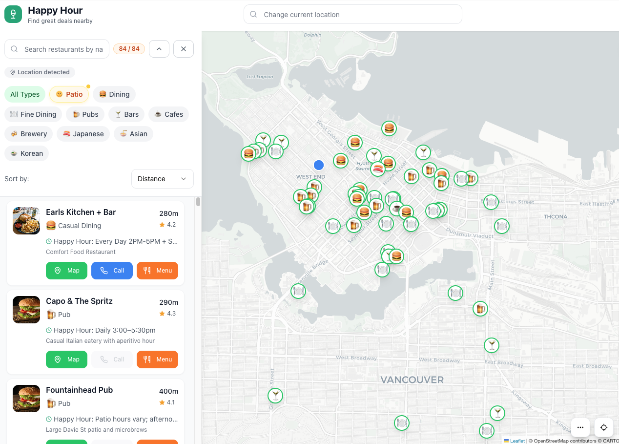 HappyHourMap is a location-based web application that connects users with nearby happy hour specials. The platform offers real-time filtering by time, distance, cuisine category, and deal type, helping users discover relevant promotions while driving traffic to local establishments.