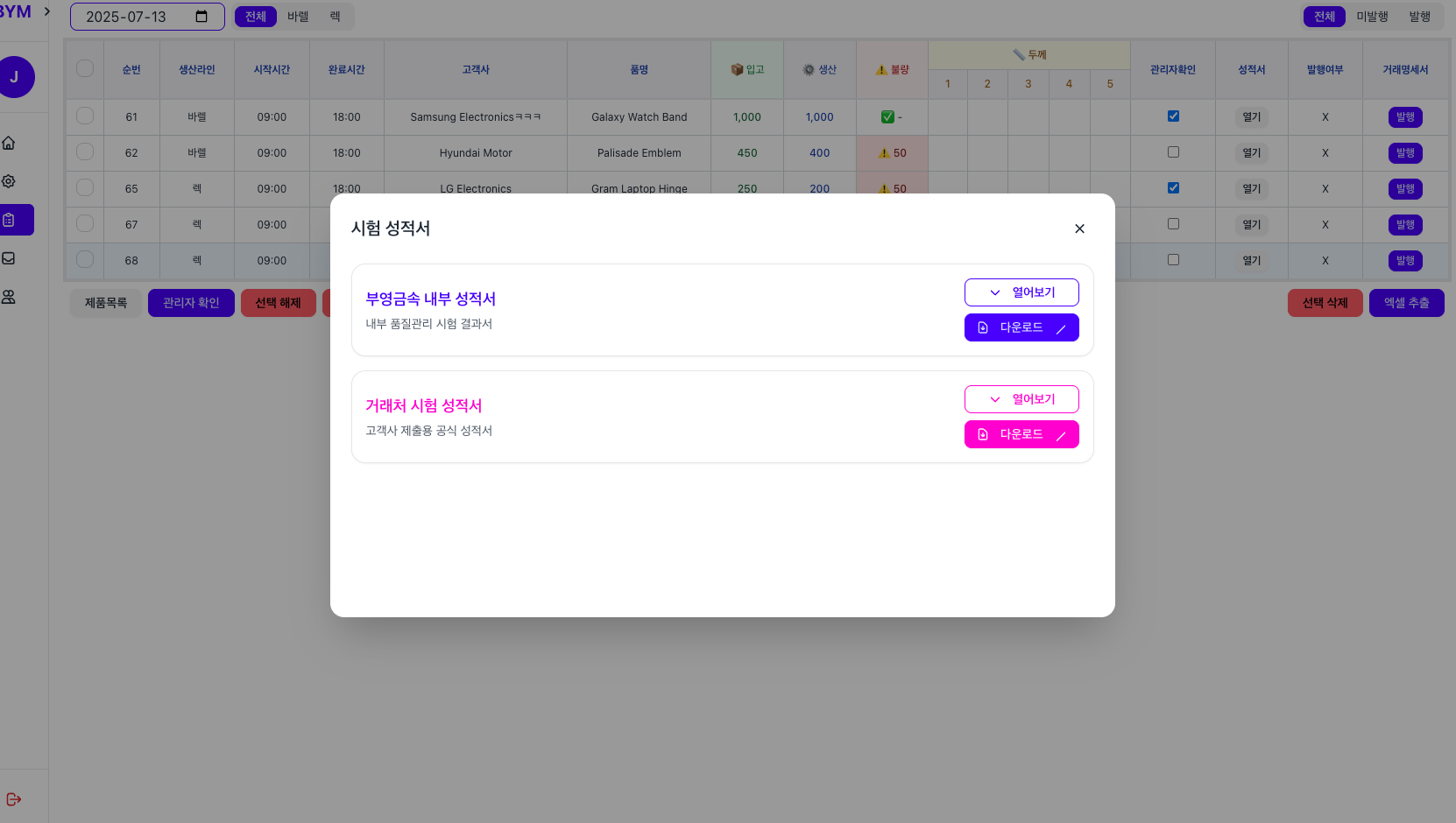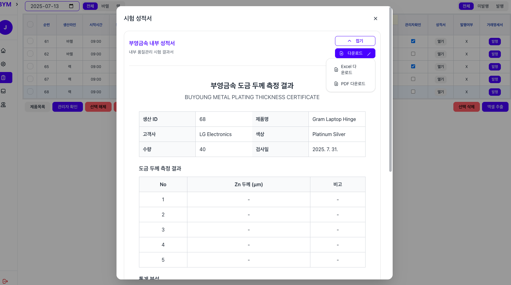 Designing an automated certification generation system that produces standardized quality assurance documents required by downstream customers. The system will dynamically create certificates based on production data, allowing export to PDF, Excel, or direct sharing via secure AWS S3 presigned URLs. This feature aims to significantly reduce the time spent on manual certificate creation.